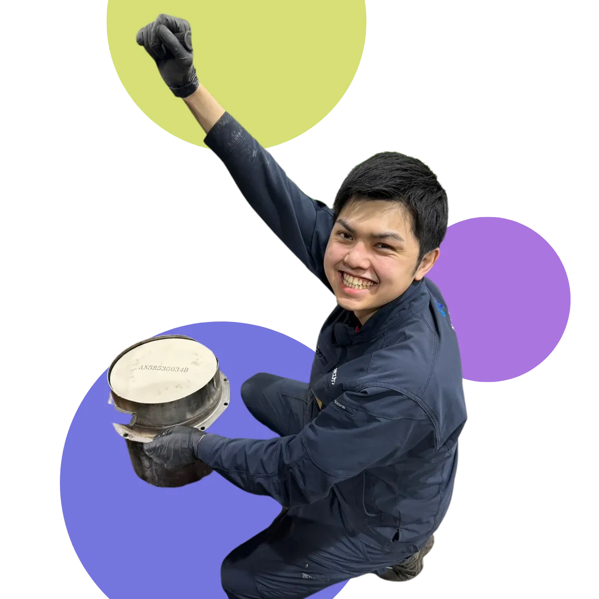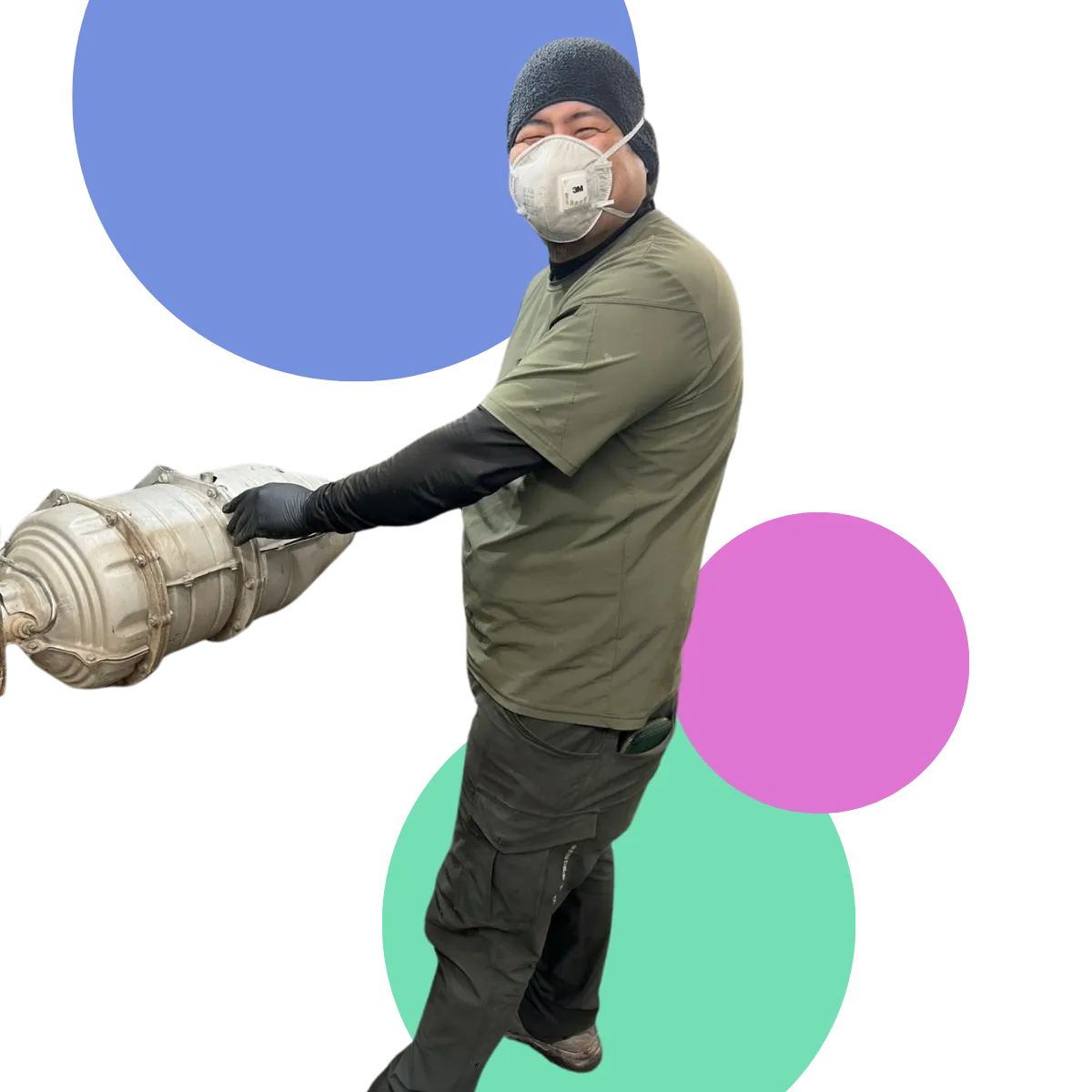 グラインダーを使用し、マフラーを切断。内部を傷つけず分解し、再利用可能な部品を選別します。
